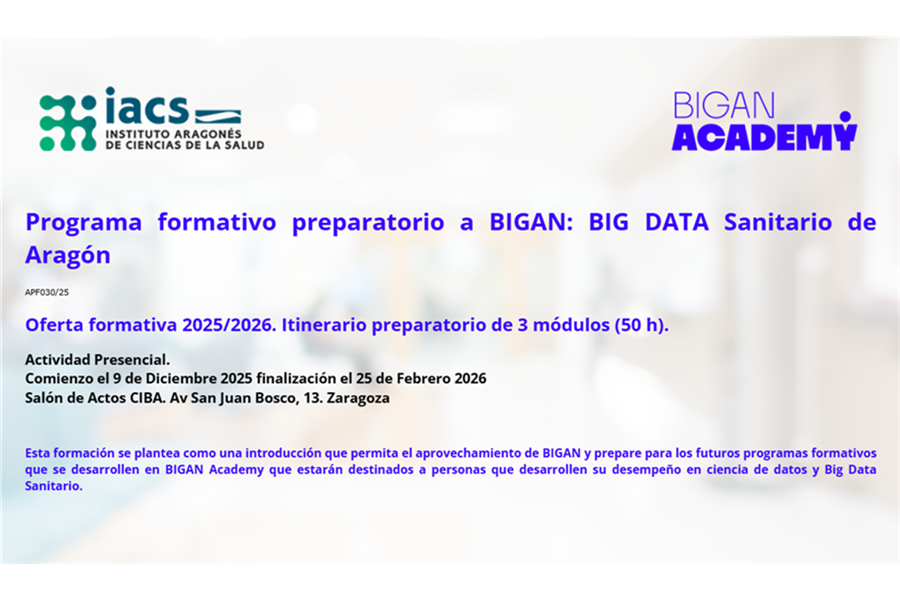 Programa formativo preparatorio a BIGAN: BIG DATA Sanitario de Aragón APF030/25. Actividad Presencial. Comienzo el 9 de Diciembre 2025 finalización el 25 de Febrero 2026 en el Salón de Actos CIBA. Av San Juan Bosco, 13. Zaragoza