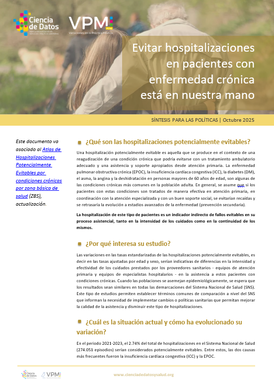 ‘Evitar hospitalizaciones en pacientes con enfermedad crónica está en nuestra mano’ es un report ‘Síntesis para las políticas’, incluye recomendaciones para la toma de decisiones derivadas del Atlas de Hospitalizaciones Potencialmente Evitables por zona básica de salud 2021-2023.
